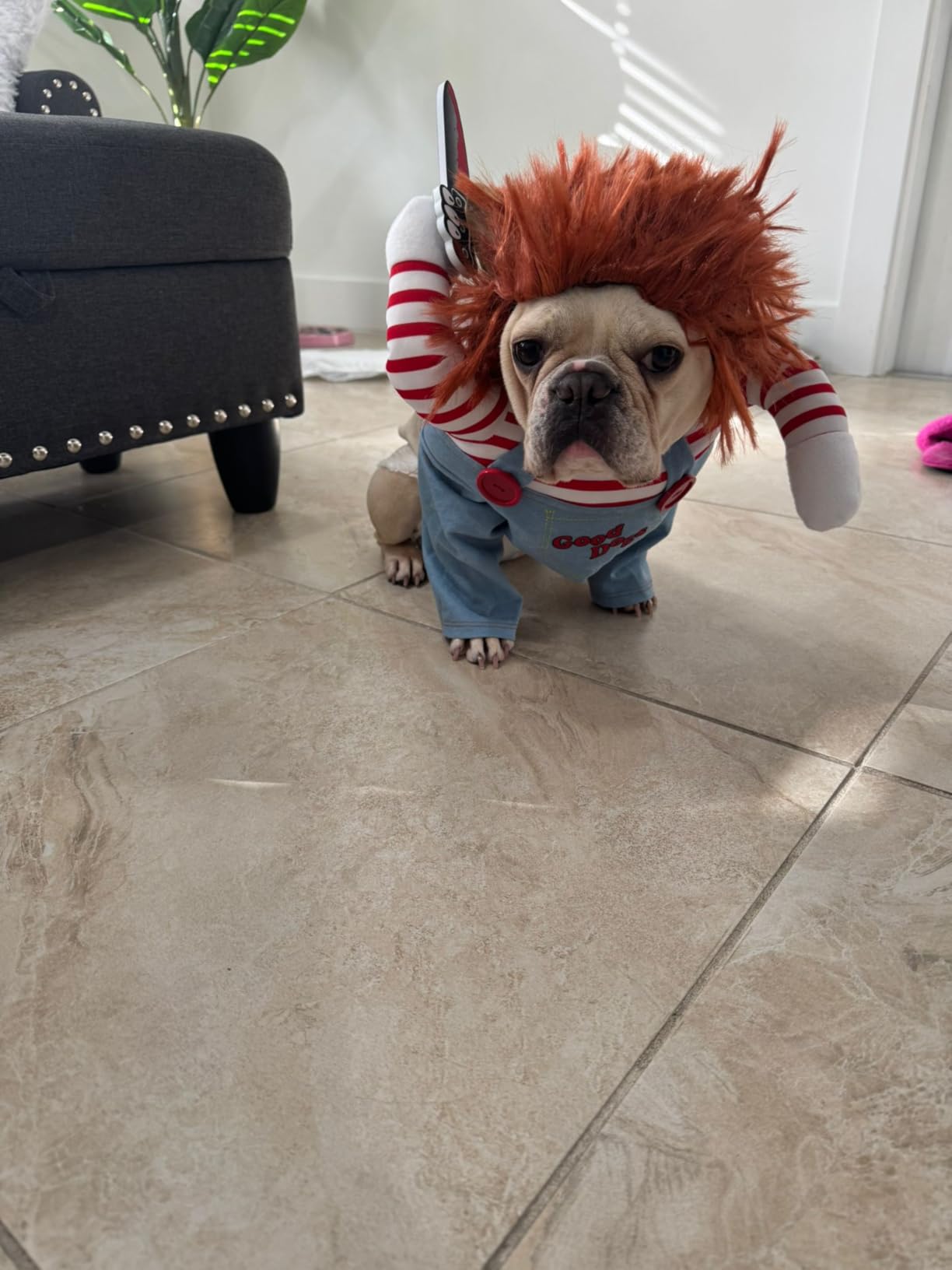 Imagine the photo ops, the laughs, and the double-takes as your Frenchie channels their inner Chucky, prancing around like the cuddliest little horror movie star. It’s not just a costume. It’s an experience – both for your pup and for everyone who gets to witness their terrifying transformation.
