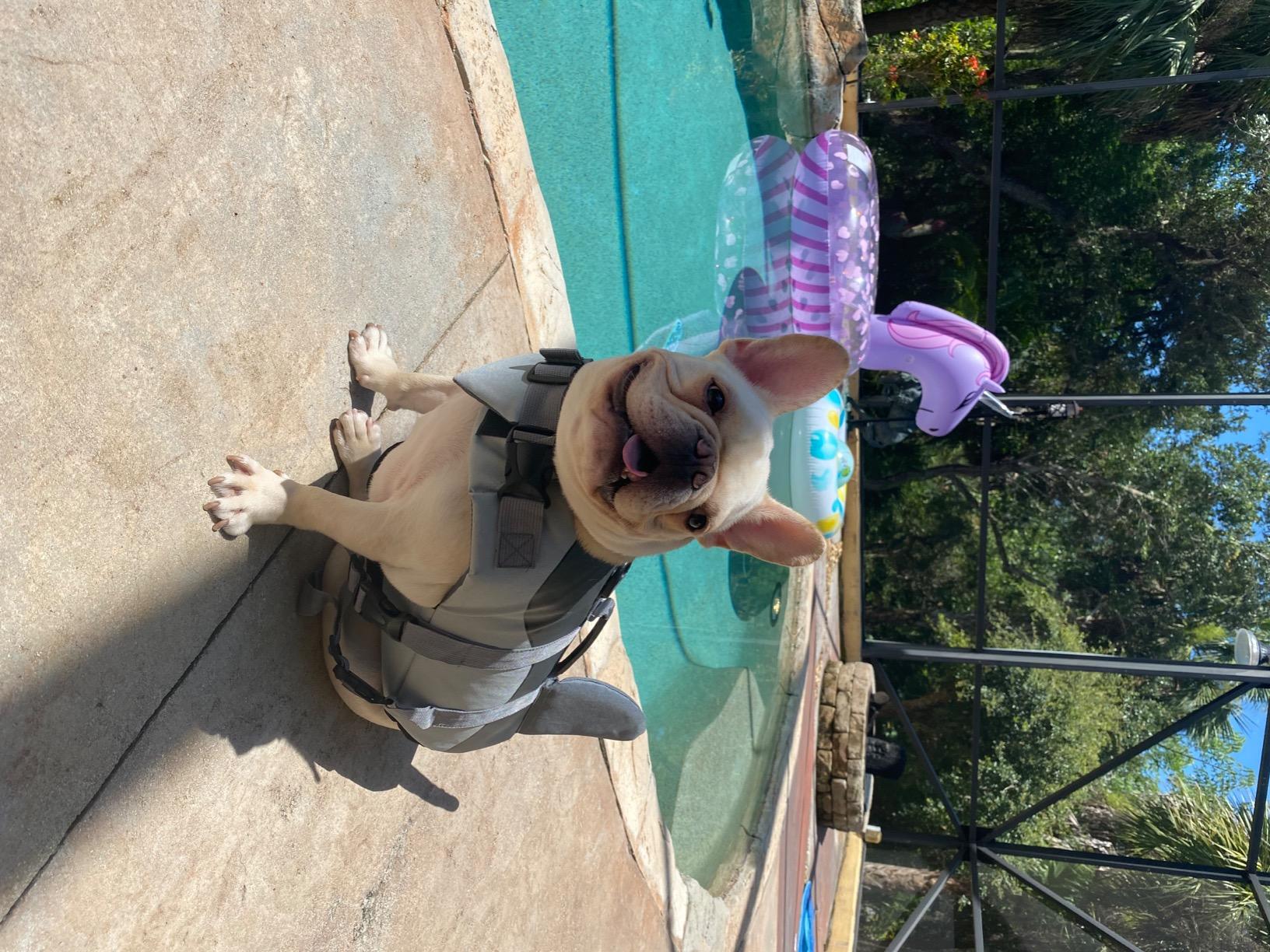 Our French bulldog doesn’t seem to mind having the life jacket on. It’s adjustable, so it fits well. We got a medium and it’s perfect. We haven’t tried it in the water yet.